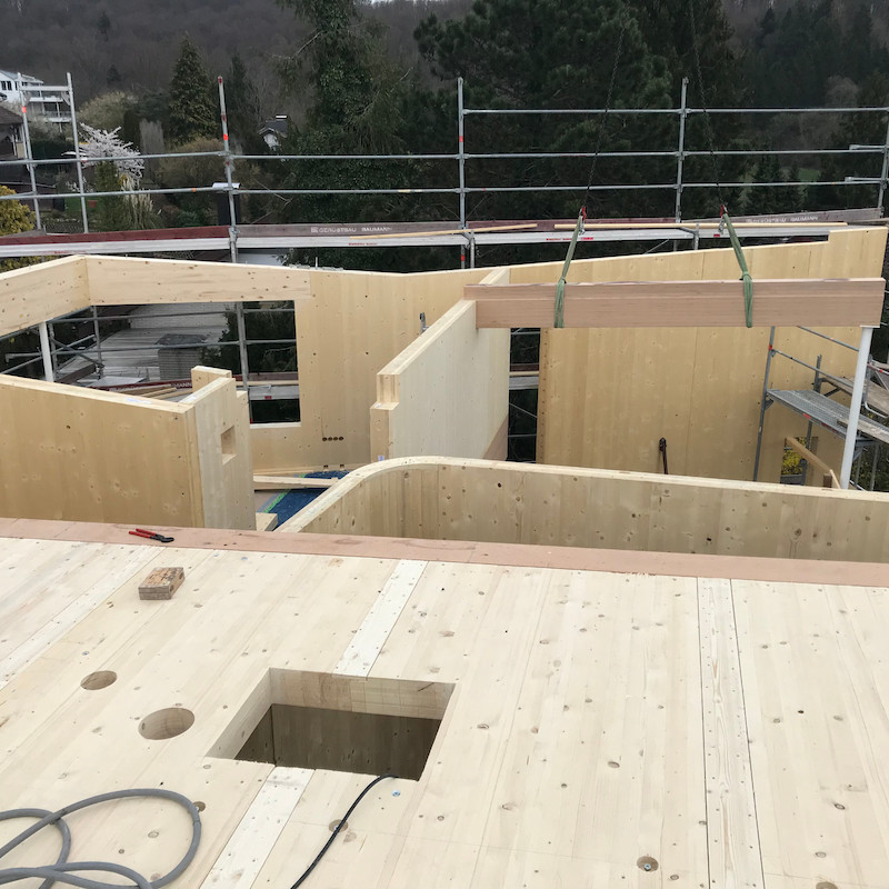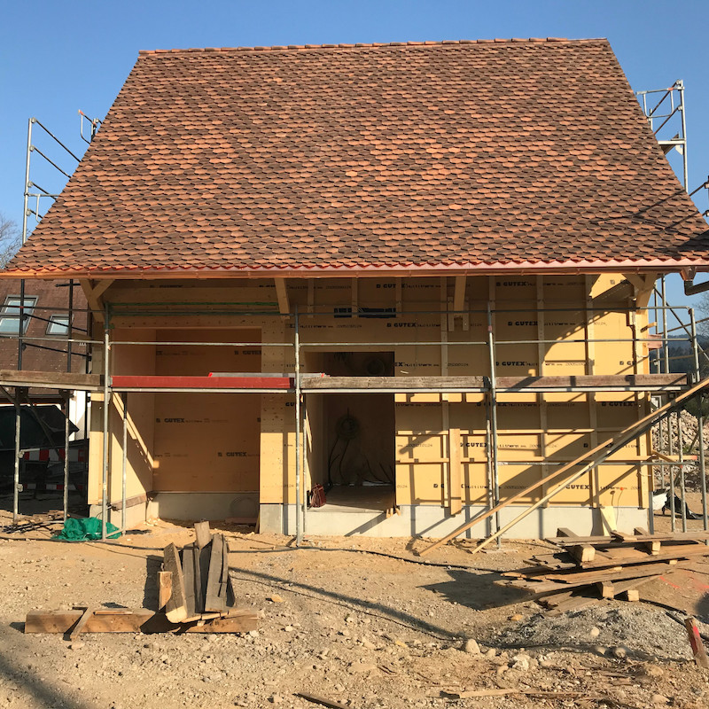 Auf einem Bestandskeller wird ein Wohnhaus in Massivholzbauweise errichtet • Verwendung von baubiologisch gesunden, umweltfreundlichen und schadstoffminimierten Materialien