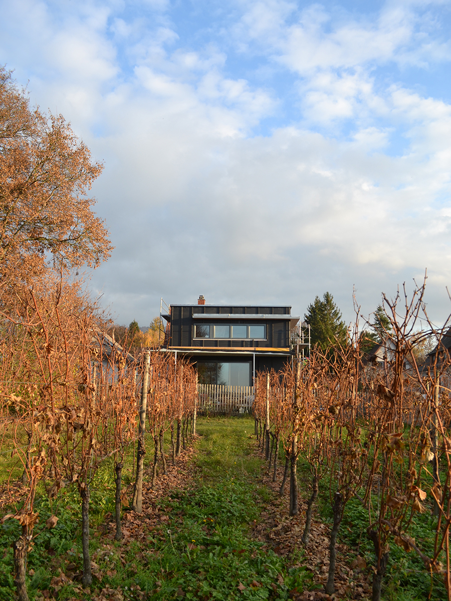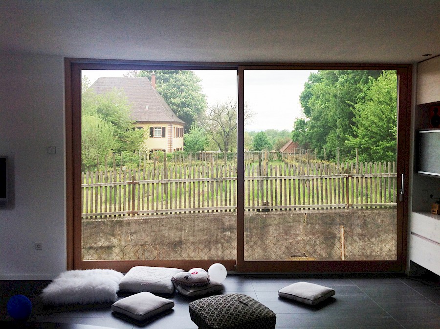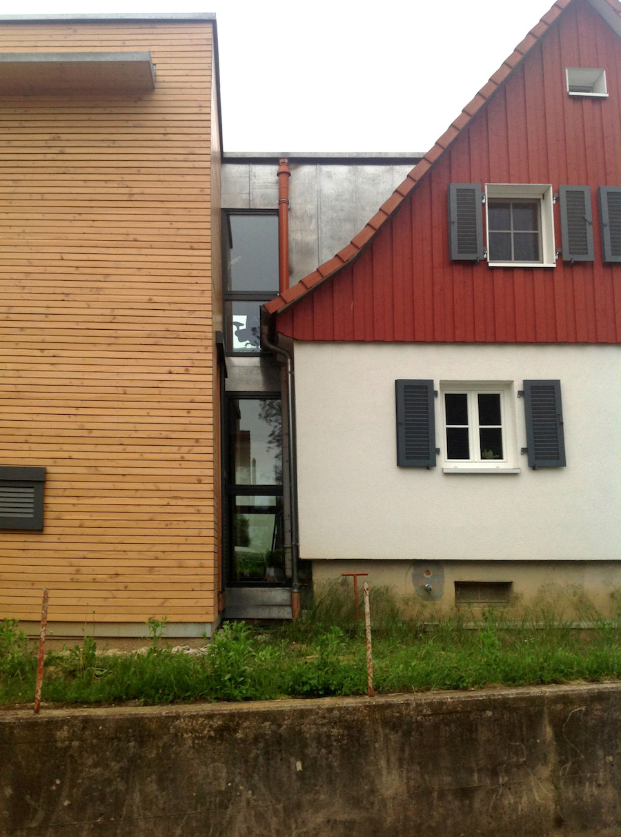 | Entwurf | Das bestehende liebevoll sanierte Wohnhaus von 1920 wurde aufgrund von Familienzuwachs zu klein. Bewusste Gegenüberstellung von Alt und Neu. Ein eigenständiger Baukörper platziert sich an den äußeren Rand des Grundstücks. Alle Öffnungen z.B. die große Fensterfont im Wohnbereich richten sich mit grandiosen Ausblicken über den Pfarrgarten auf Kaiserstuhl und Vogesen. Der Übergang von Bestand und Neubau mit einer Glasfuge schafft einen neuen Arbeitsplatz im OG. |