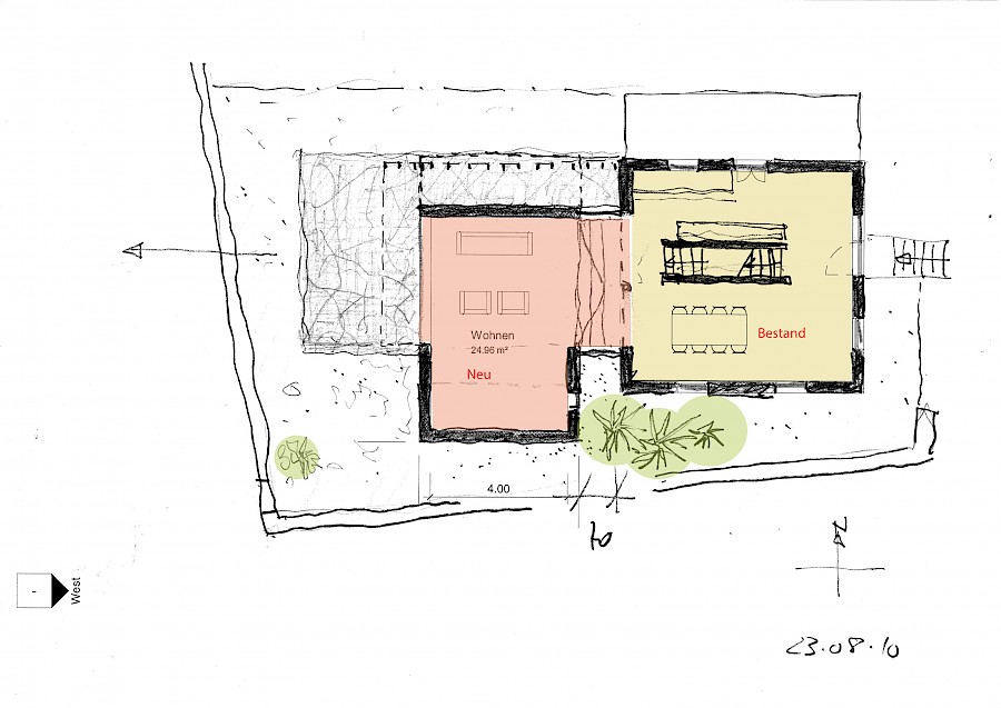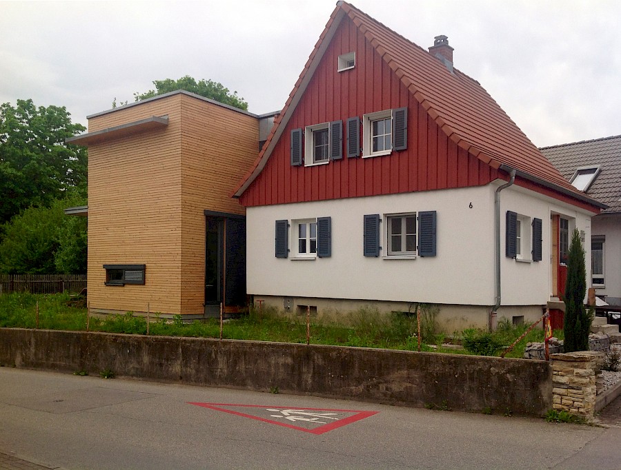 | Aufgabe | Minimales Platzangebot im Bestandshaus soll maximal erweitert werden: im EG Wohnraum, im OG Schlafzimmer + Bad |